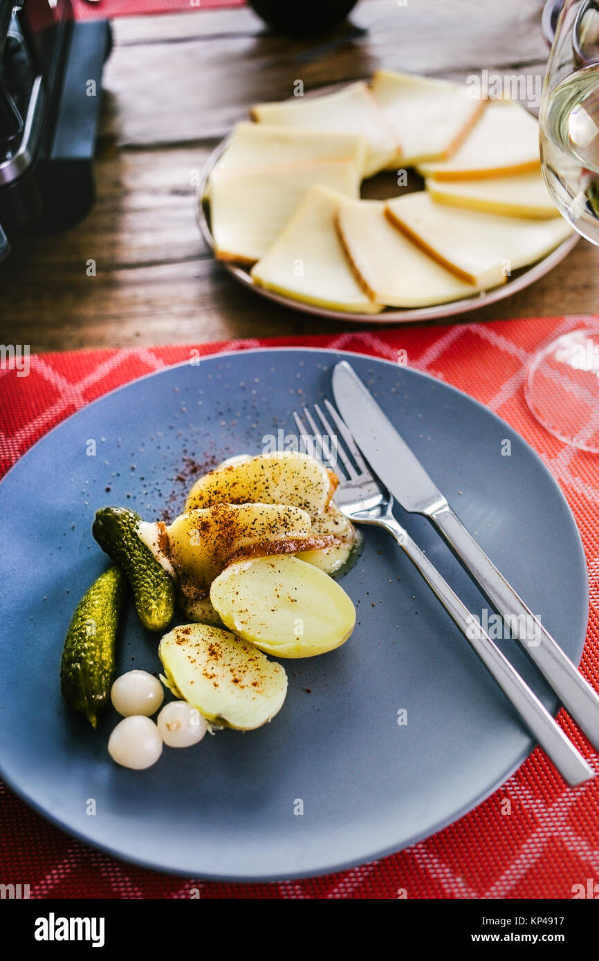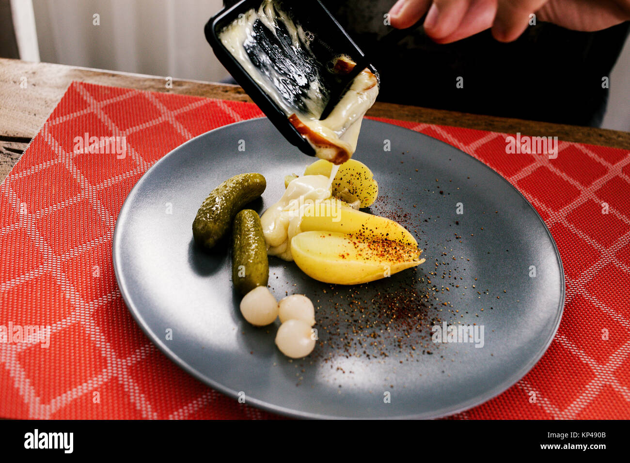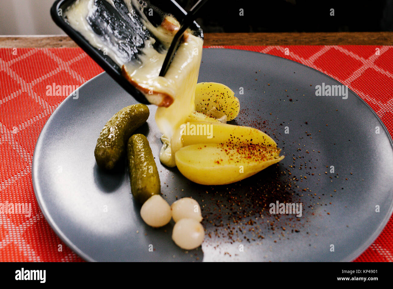 Swiss Traditional Dish Called Raclette Including Steamy Potatoes Melted Cheese And Pickles Eaten At Christmas And Wintertime Stock Photo Alamy